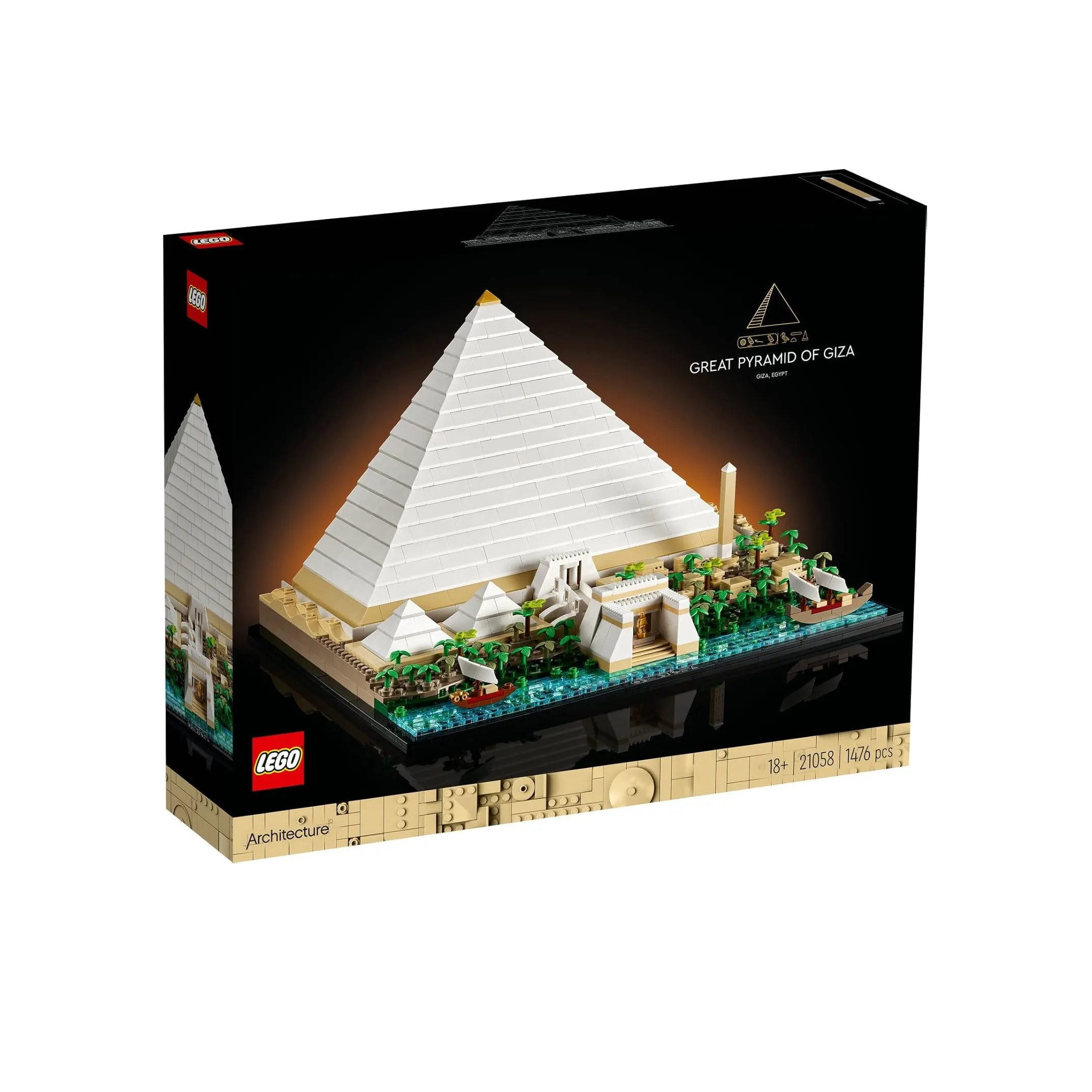 Take an imaginative leap back in time to the 26th century BC and experience the building of one of the Seven Wonders of the Ancient World with this LEGO® Architecture Great Pyramid of Giza model (21058). Build a beautifully detailed cross-section model of the Great Pyramid, revealing its main tunnels and chambers and the system that may have been used to move huge stones during its construction. Visualise how this area by the River Nile is thought to have looked in ancient times, with 2 small pyramids, 2 mortuary temples, Sphinx statues, an obelisk and more.