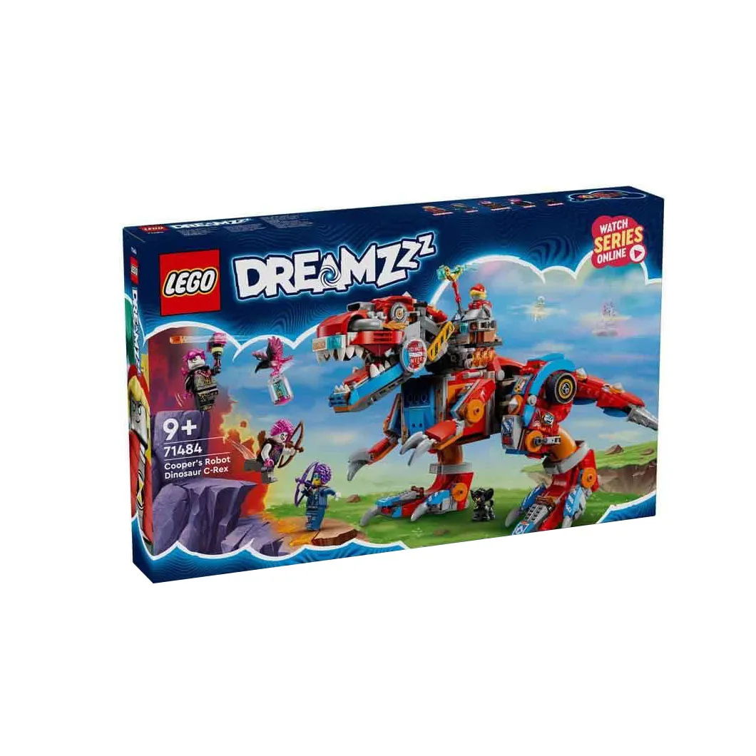 Let kids roar into adventure with LEGO® DREAMZzz™ Cooper’s Robot Dinosaur C-Rex (71484), a rebuildable dinosaur set for ages 9+. Transform Cooper’s LEGO junkyard into either a T. rex action figure or a pterodactyl toy, both featuring articulated heads, snapping jaws, thrashing tails, and twin shooters for thrilling play.