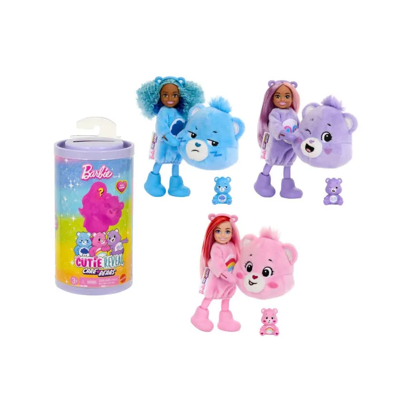 A surprise‑unboxing playset featuring a small Chelsea doll hidden inside an adorable plush Care Bears costume. Kids lift the costume head to reveal the Chelsea doll with colorful streaked hair and discover 6 fun surprises. The plush costume can be flipped into a cozy oversized jacket for the doll, and the costume head becomes a bed for the mini Care Bears friend, adding extra play value and imaginative storytelling fun.