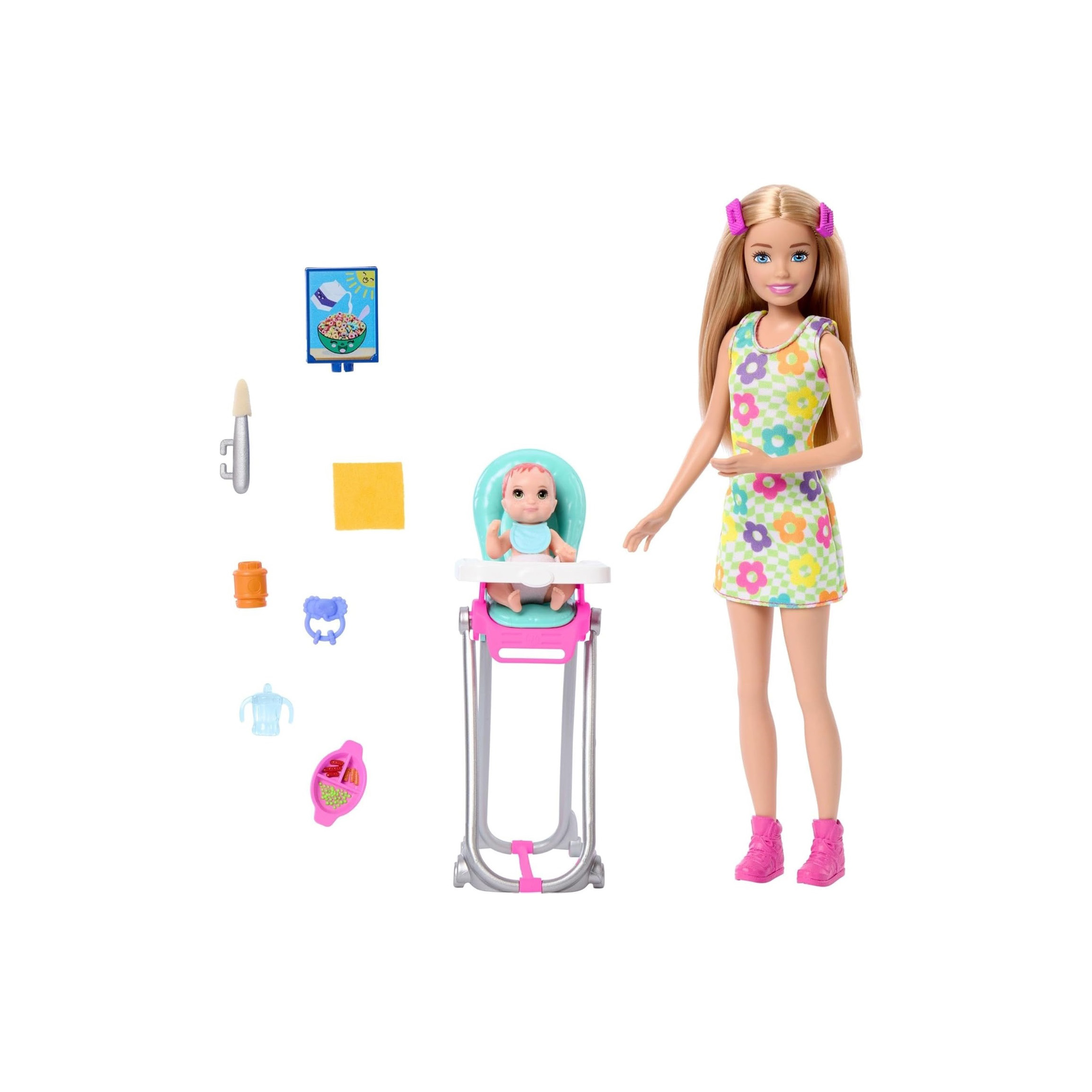 Included Accessories: Skipper doll, baby doll, highchair, sponge spoon, bib, sippy cup, food plate, and 4 additional accessories (10 pieces total)