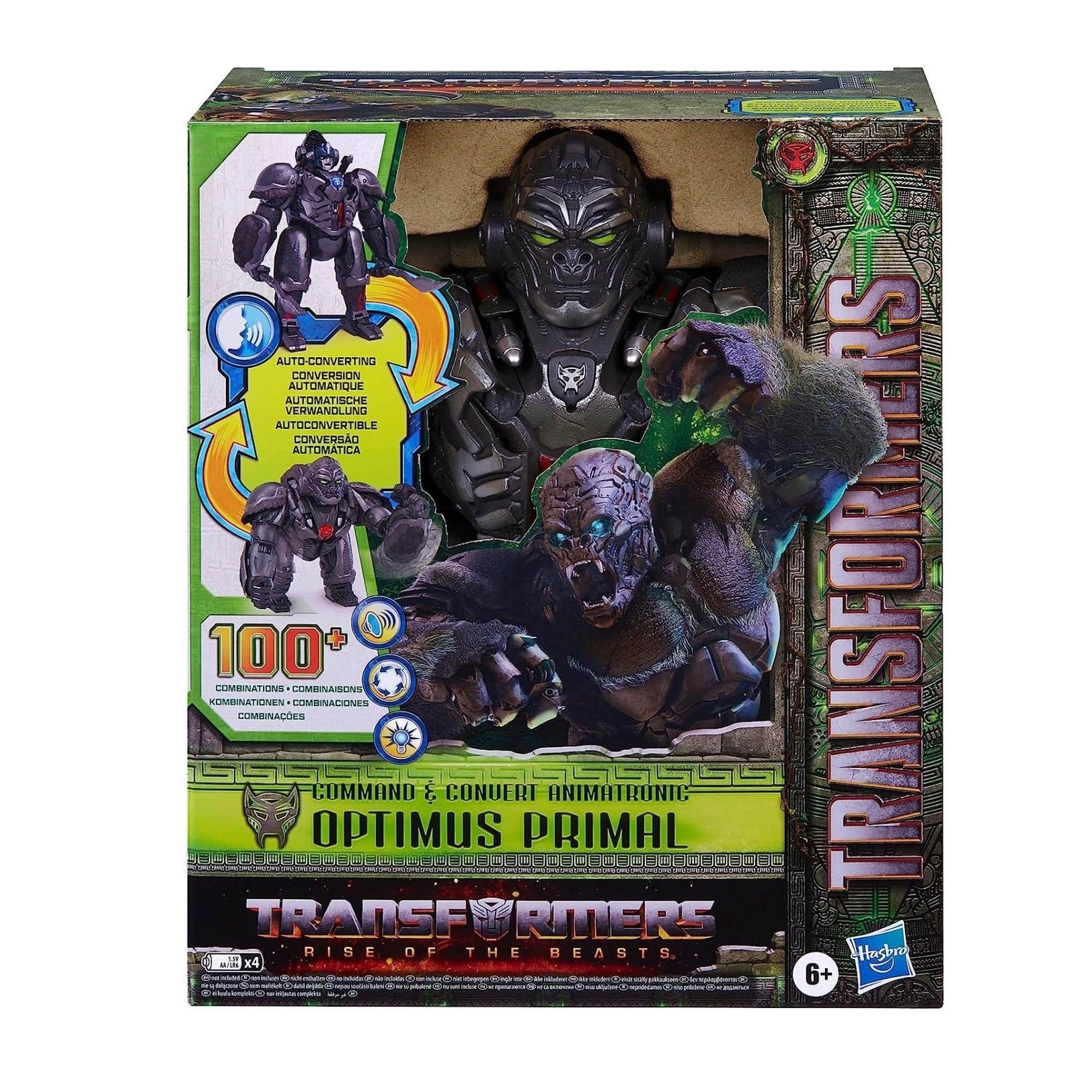 The Transformers: Rise of the Beasts Command & Convert Animatronic Optimus Primal Toy (F3937) is an interactive action figure inspired by the movie Transformers: Rise of the Beasts. This advanced animatronic figure responds to commands and automatically converts between robot and gorilla modes, delivering immersive sound, motion, and action-packed play for young Transformers fans.