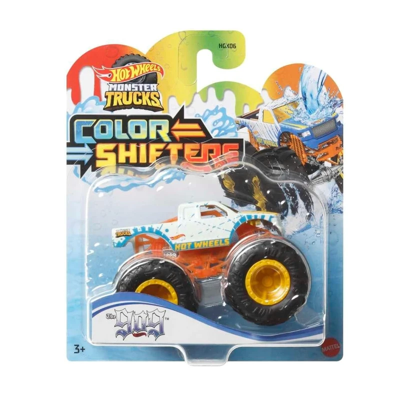 A Hot Wheels Monster Trucks die‑cast vehicle from the Color Shifters series that changes color when exposed to water. This rugged truck combines monster‑truck styling with interactive color‑change play, perfect for splash adventures, imaginative stunts, and vehicle collecting.